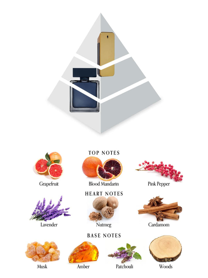 يفتتح العطر برائحة الحمضيات الطازجة والفلفل الوردي الحار، ويتطور إلى قلب من اللافندر العطري والأخشاب الدافئة والحسية. تستقر القاعدة في مزيج غني من المسك والعنبر والباتشولي، مما يخلق انطباعًا عميقًا ودائمًا يبقى حتى اخر الليل.